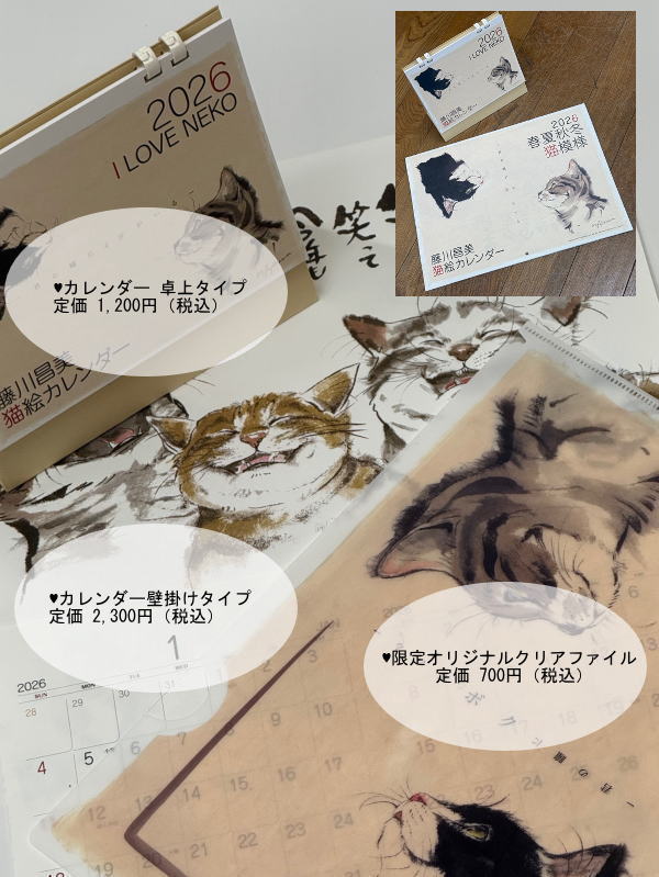 ■壁掛けカレンダー(中綴じタイプ)サイズ;横300×縦440mm 1冊2,300円(税込) ■I LOVE NEKO 卓上カレンダー サイズ;横160×縦128mm 1冊1,200円(税込) ■ご予約ご注文の方には、オリジナルカラークリアファイルが1枚ついてきます ■クリヤファイルは限定数量生産のため、在庫が無くなり次第、販売終了となります。ご了承下さい。