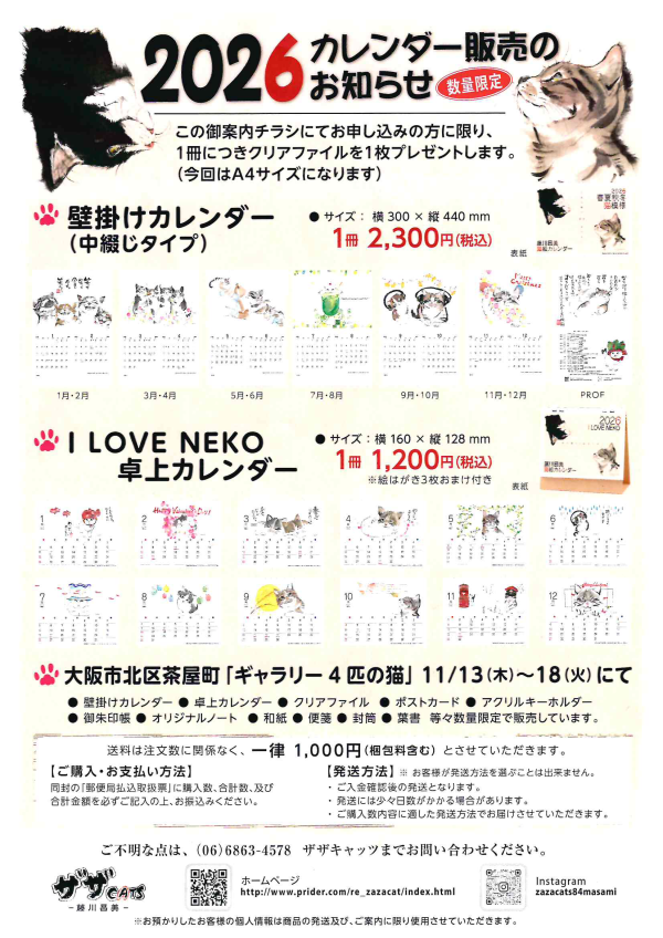 2026・猫絵カレンダー販売のお知らせ(数量限定)