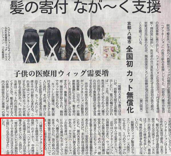 記事には、 病気で髪を失った子供らへの医療用ウィッグの制作に必要な毛を寄付する「ヘアドネーション」の取り組みを、 京都府八幡市が全国初の「カット無償化」に向け、助成事業を始めた事を取り上げています。