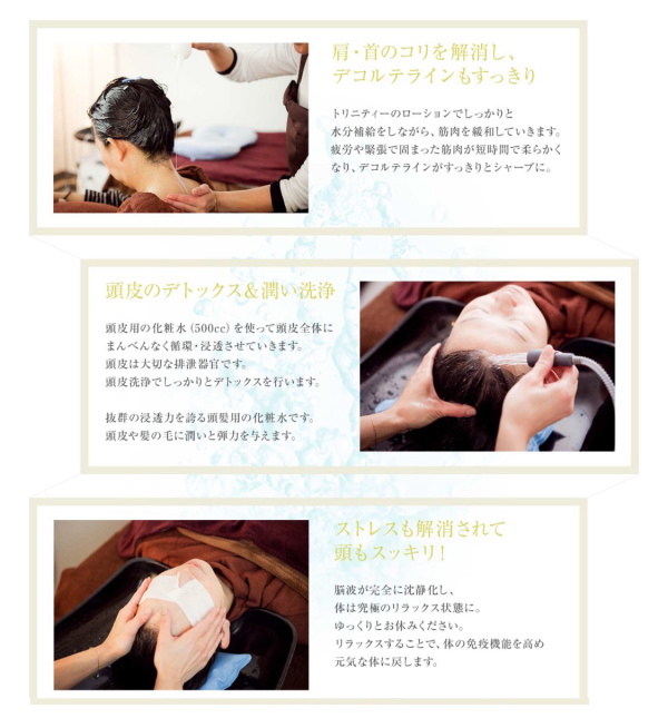 頭皮の血流を促進、リンパの流れを整え、シワ、たるみを解消します。皮脂のつまりを除去し、 抜け毛やフケ、かゆみ、臭いを予防。育毛促進、抜毛の予防にも効果大!頭皮のリラックスでストレス解消。 頭痛、眼精疲労、精神疲労を緩和します。シャンプーでは取りきれない毛穴の汚れを綺麗にします。